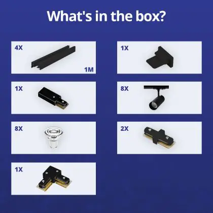 | Nome del fabbricante | Complete L shaped 1-Phase Track Set Black incl. 8x Spot fixture + GU10 2700K 3W Dim – 2 x 2 meter i | |