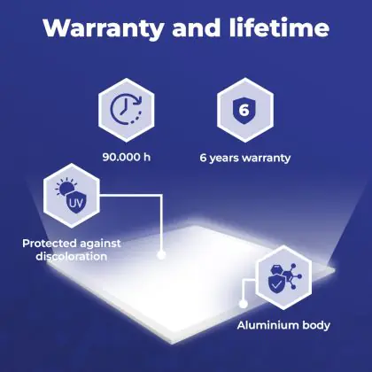 Questo pannello LED ha un ciclo di vita di 90000 ore, che vuol dire che funzionerà in modo ottimale per diversi anni. Questo ti permetterà di risparmiare sui costi di manutenzione e sostituzione! Inoltre, questo pannello LED è protetto da una garanzia di 6 anni. Infine, l'illuminazione LED permette di ridurre le emissioni di CO2 e, non contenendo sostanze tossiche, i LED possono essere riciclati